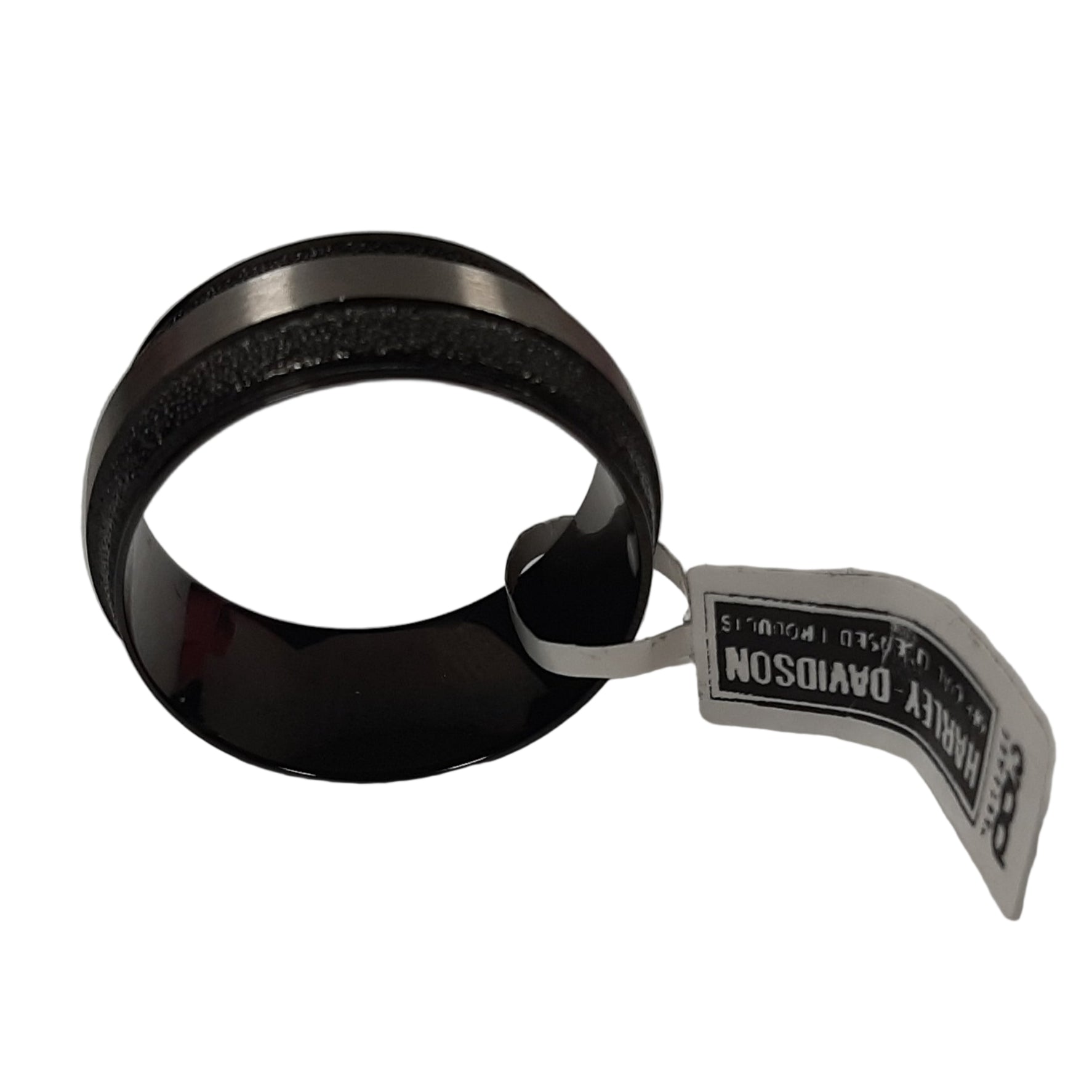 The ring is made from black stainless steel that is textured. In the center, there is the typical Harley Davidson logo in silver which is positioned in the middle of the ring, there is also strong silver band that follows around the entire ring.
