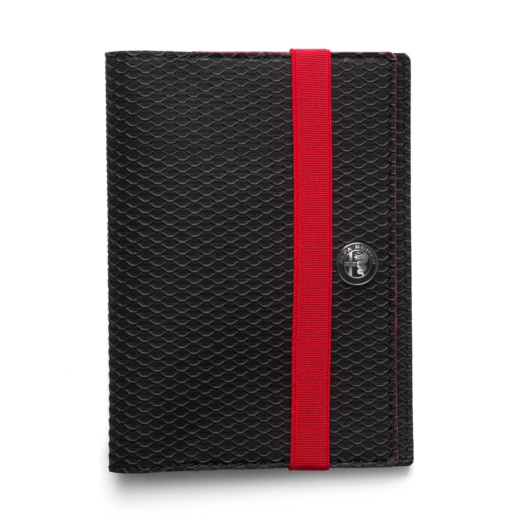 Keep your car registration documents on hand in this sleek, sophisticated folder. Black cover with inner red velvet touch and matching red elastic band. Finished by a metallic Alfa Romeo pin.